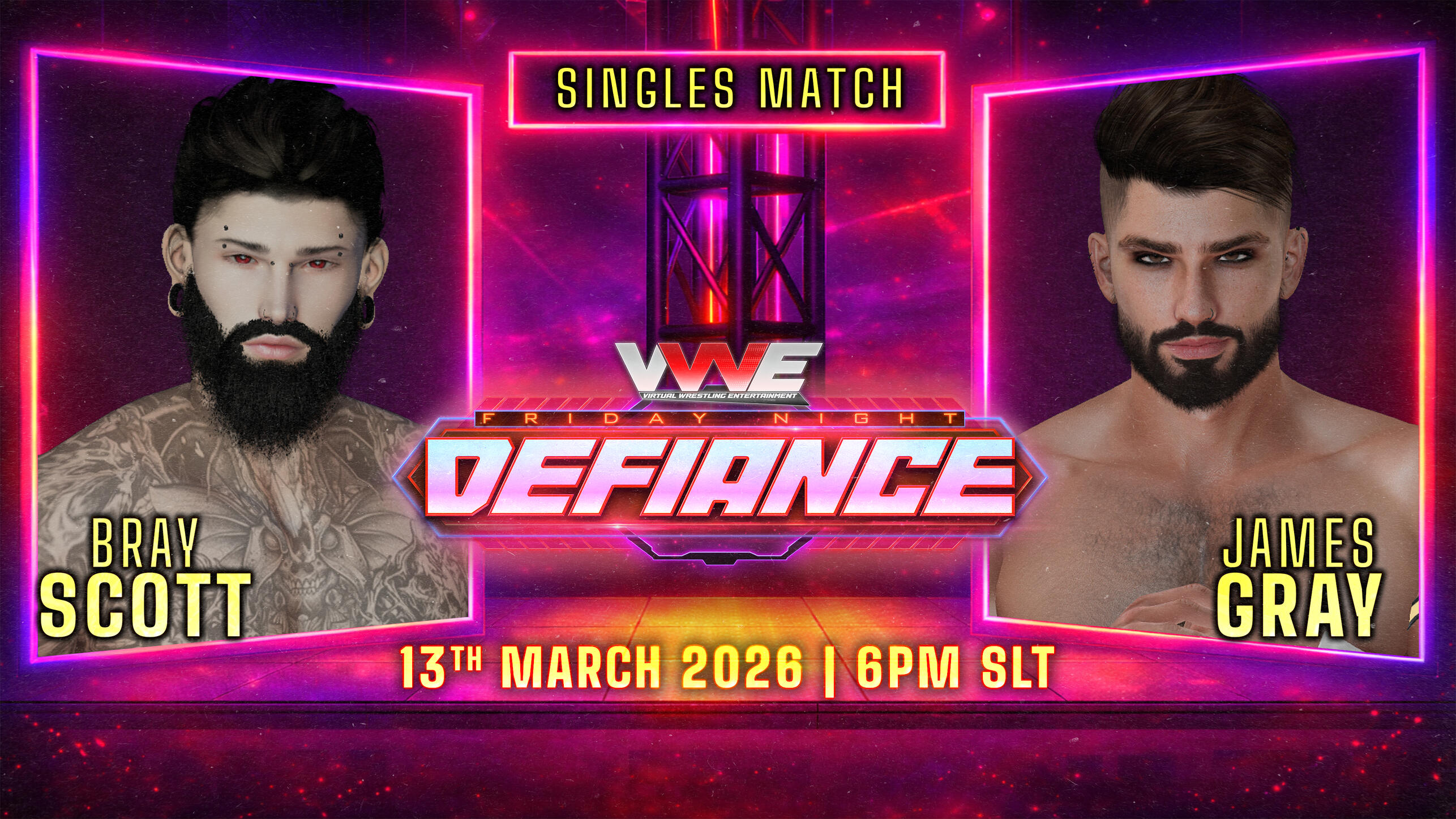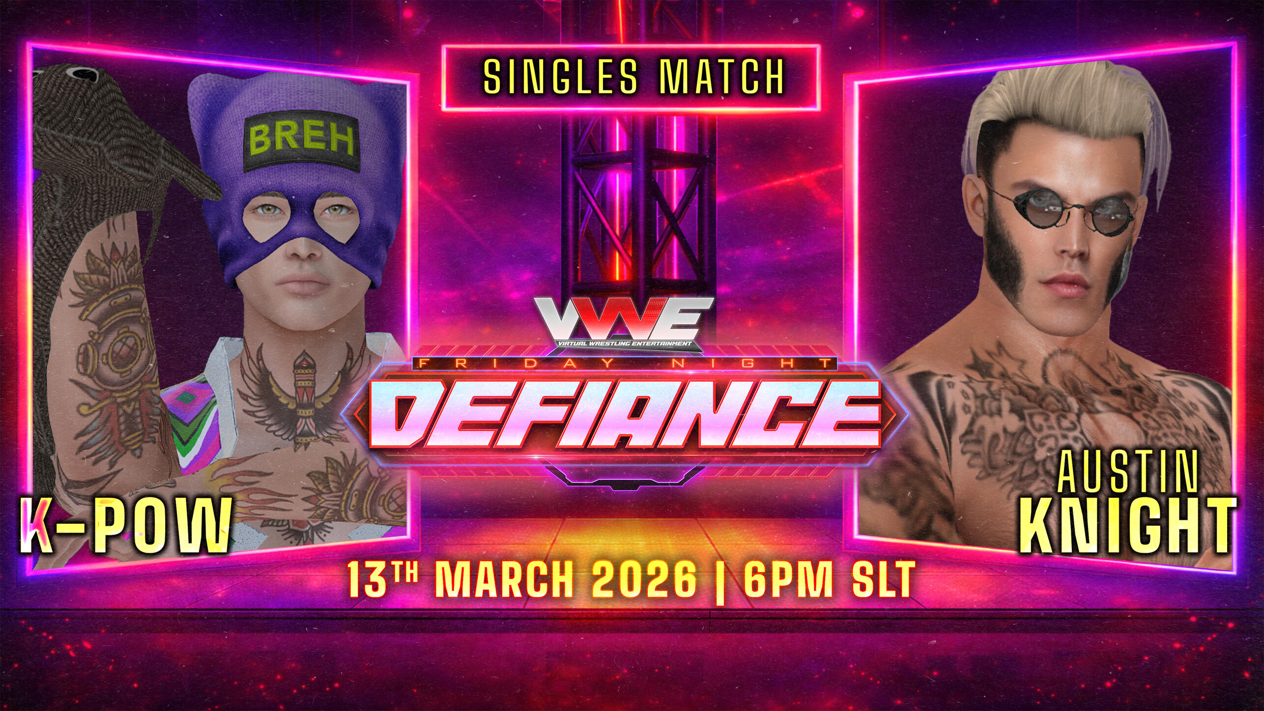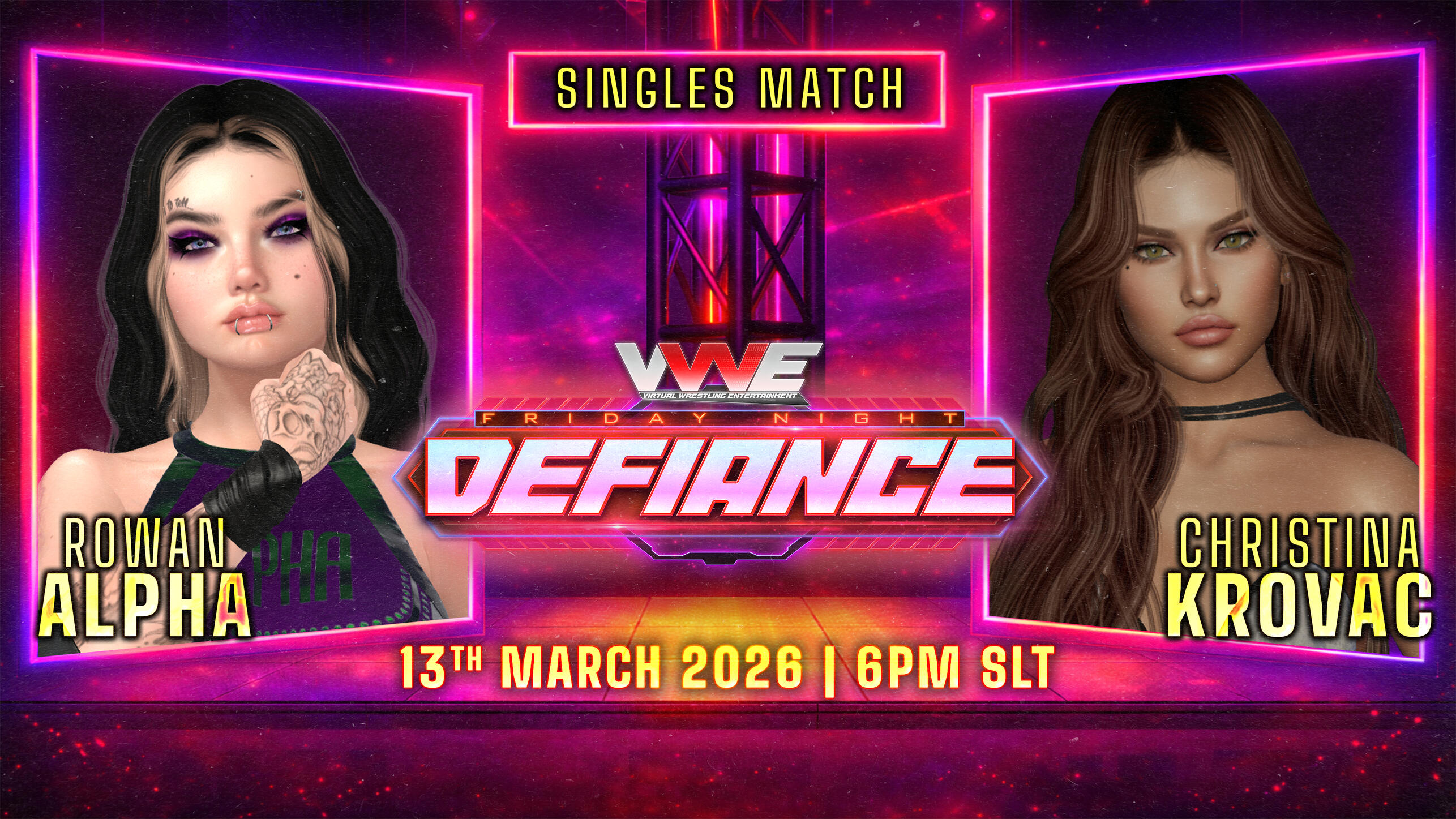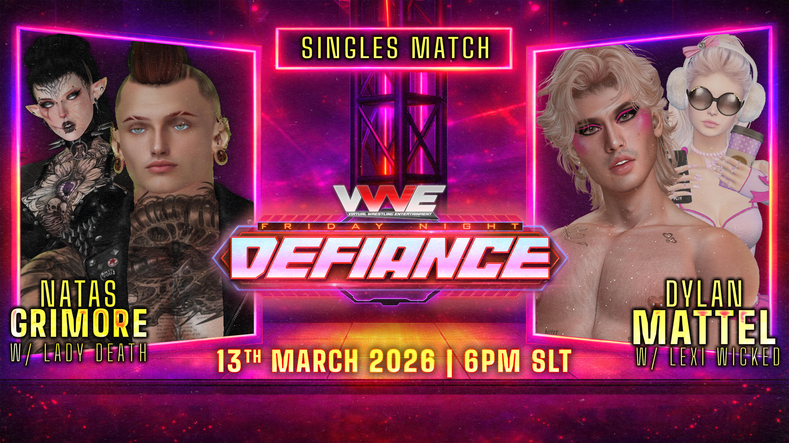 VWE DEFIANCE comes to you every Friday at 6:00pm SLT at the stage for Victorious 6 at Dark Fae. Each week we bring you awesome wrestling action. Here is the lineup for Friday March 13th: